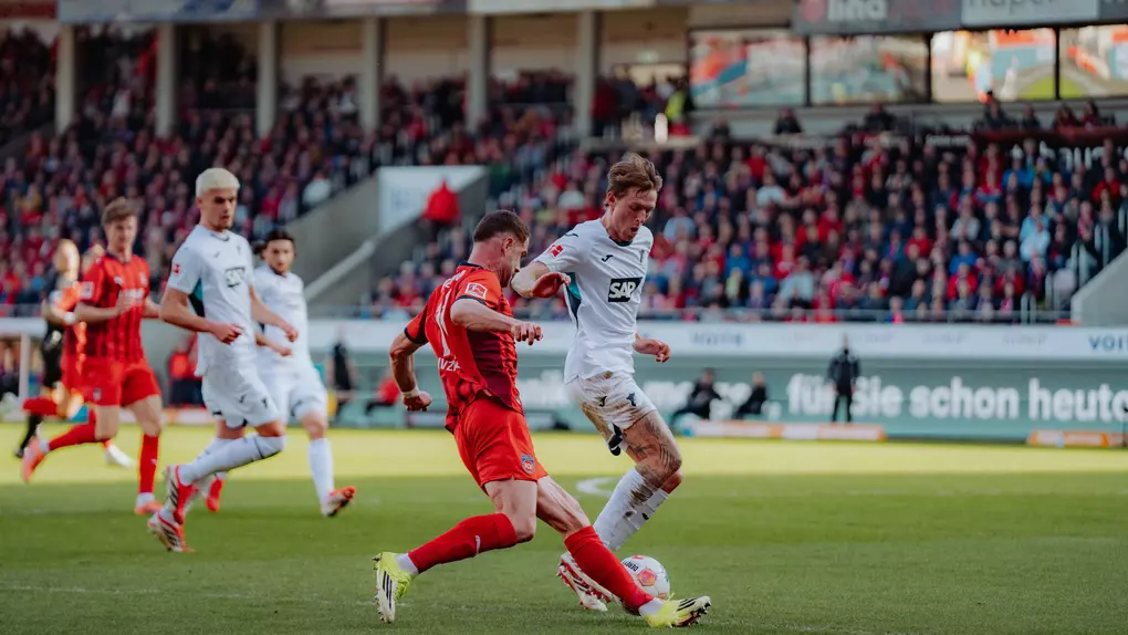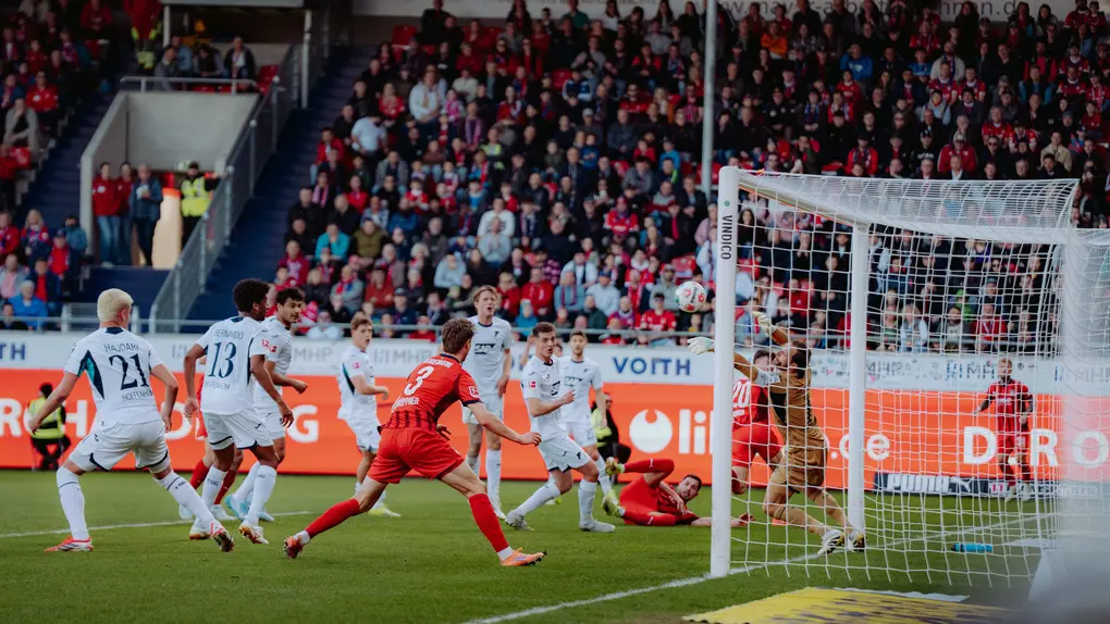 Mit fünf Veränderungen in der Startelf im Vergleich zur Vorwoche gegen Werder Bremen ging unser Cheftrainer Frank Schmidt in die Partie. Ganze 15 Minuten dauerte es bis zur ersten nennenswerten Aktion der Partie – und diese gehörte unserem Team. Eine Flanke von der linken Seite legte Patrick Mainka per Kopf auf Mathias Honsak ab, dessen Direktabnahme das Tor jedoch knapp verfehlte. Auch danach spielte sich vieles im Mittelfeld ab, klare Torchancen blieben Mangelware. Dann kam es jedoch leider, wie es kommen musste: In der 26. Minute spielte sich die TSG erstmals gefährlich vor unser Tor. Über Hajdari und Coufal gelangte der Ball auf die rechte Seite zu Alexander Prass. Dieser zog aus rund 18 Metern in halbrechter Position ab und traf mit Unterstützung der Unterkante der Latte zur 1:0-Führung für die Gäste – Diant Ramaj war dabei chancenlos.