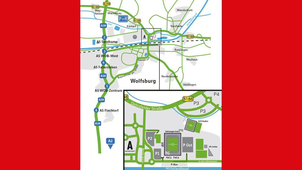 Für Fans, die mit dem Pkw anreisen, stehen rund um den Allerpark – Allerpark 1, 38448 Wolfsburg – kostenlose Parkplätze (P3 & P4) zur Verfügung. Wir empfehlen aus Richtung Westen entsprechend der Beschilderung die Anfahrt über die A 39 und die B 188, auch wenn Navigationsgeräte diese Route häufig nicht vorschlagen. Nutzt diese bitte bei An und Abfahrt, um das Verkehrsaufkommen in der Innenstadt zu umfahren und damit die Beeinträchtigungen für jeden zu verringern.